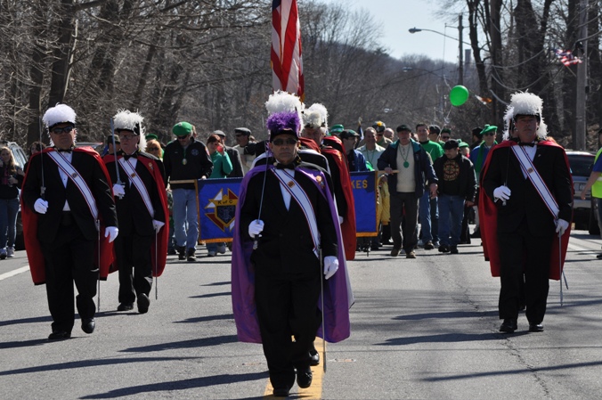 The Color Corps Mother Cabrini Color Corps leading Knights in the 2012 Northern Westchester/Putnam St. Patrick's Day Parade Each level within the hierarchy of the Fourth Degree had its own color scheme. The Vice Supreme Master wore a blue cape and chapeau. The Master wore a gold cape and chapeau. The District Marshal wore a green cape and chapeau. The Navigator of an assembly wore a white cape and chapeau, while his Color Corps Commander wore a purple cape and chapeau. All other members of the Color Corps wore a red cape and white chapeau. The current uniform includes a beret with an insignia backing that maintains this color scheme except that regular members have no color-backing to their insignia. In 2023, Supreme Council instituted the additional use of a colored baldric (sash) following the same color scheme. Our Faithful Color Corps Commander is Sir Knight Mike O'Brien. The uniform of the Fourth Degree was originally styled according to the formal wear of the day, at the turn of the 20th century, consisting of a top hat, Prince Albert coat, etc., with a red, white and blue baldric, on which was pinned an emblem depicting the United States Constitution. Sir Knights wore a sword with a cross-handle grip, signifying Christian Knighthood. From its beginning, the Fourth Degree provided honor guards for religious and civic ceremonies. In order to fully appreciate this uniformed degree, one must realize that in the early 1900s, civic parades and religious processions played a very important role in America’s public life -- much more so than today. For Catholics, displaying pride in their religion evoked an experience analogous to that of the patriot witnessing the national flag ascending against a clear blue sky as a band played the national anthem.